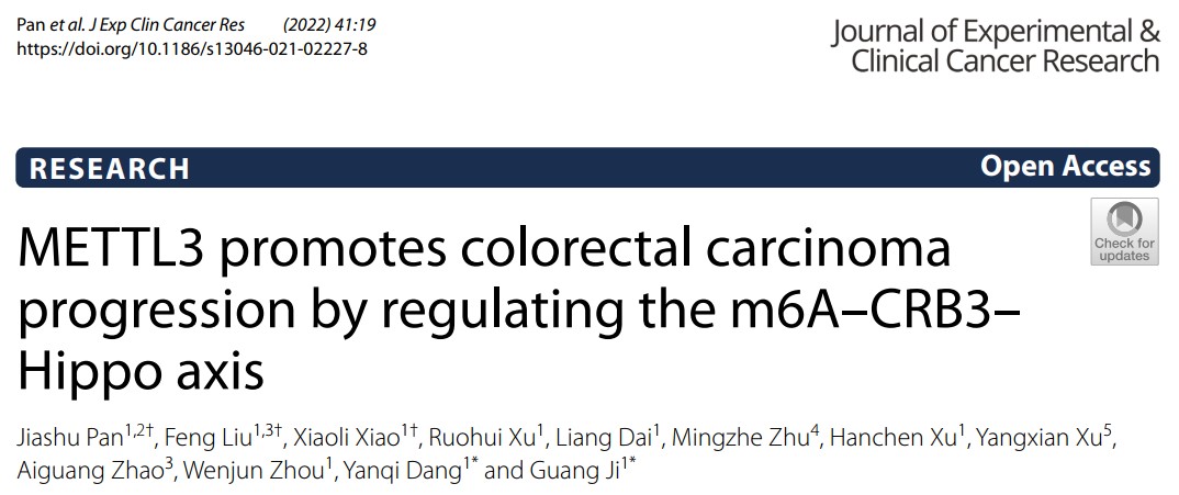 近日,附属龙华医院脾胃病研究所研究团队在结直肠癌的机制研究中取得重要进展,该发现为结直肠癌的治疗提供实验依据。研究成果METTL3 promotes colorectal carcinoma progression by regulating the m6A-CRB3-Hippo axis在国际学术期刊Journal of Experimental & Clinical Cancer Research上发表。该研究由龙华医院脾胃病研究所季光教授团队、肿瘤科赵爱光教授团队和胃肠外科许阳贤教授团队合作完成。