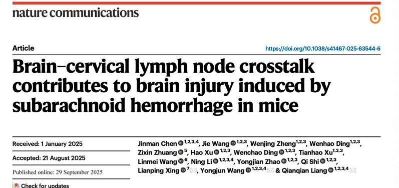 9 月 29 日,我校脊柱病研究所梁倩倩研究员、王拥军教授(通讯作者)带领陈锦漫助理研究员(第一作者)等成员完成的重磅研究成果,以“Brain-cervical lymph node crosstalk contributes to brain injury induced by subarachnoid hemorrhage in mice” 为题在国际权威期刊Nature Communications正式发表。这是我校在中西医结合防治脑部重大疾病领域的又一突破性进展,标志着学校在中医理论现代化方向上再迈新台阶。