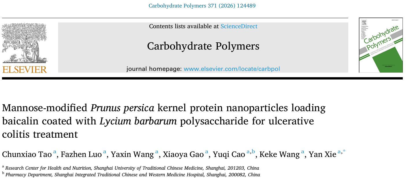 近日,公共健康学院谢燕团队在应用化学一区TOP期刊Carbohydrate Polymers发表题为“Mannose-modified Prunus persica kernel protein nanoparticles loading baicalin coated with Lycium barbarum polysaccharide for ulcerative colitis treatment”的研究成果,该研究成功构建了负载黄芩苷的甘露糖修饰桃仁蛋白/枸杞多糖纳米粒缓解溃疡性结肠炎,为天然来源载体用于疾病治疗提供新策略。