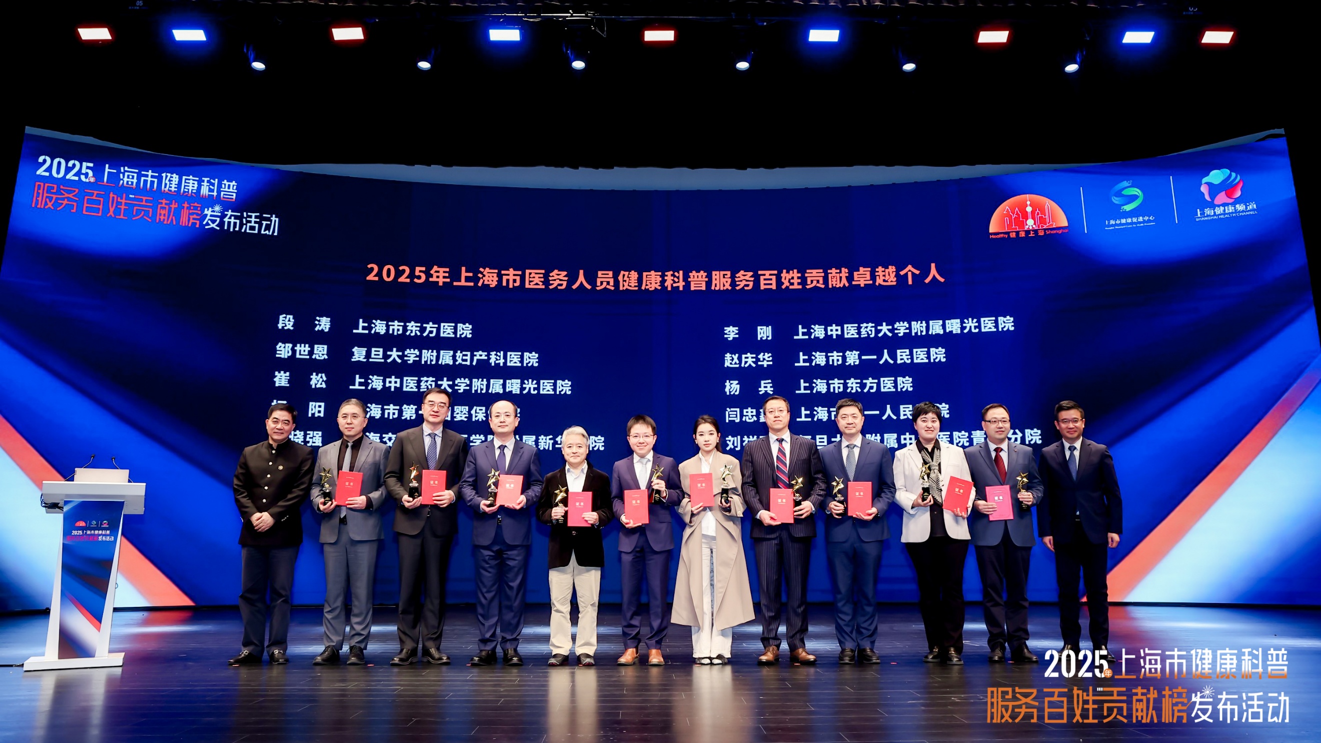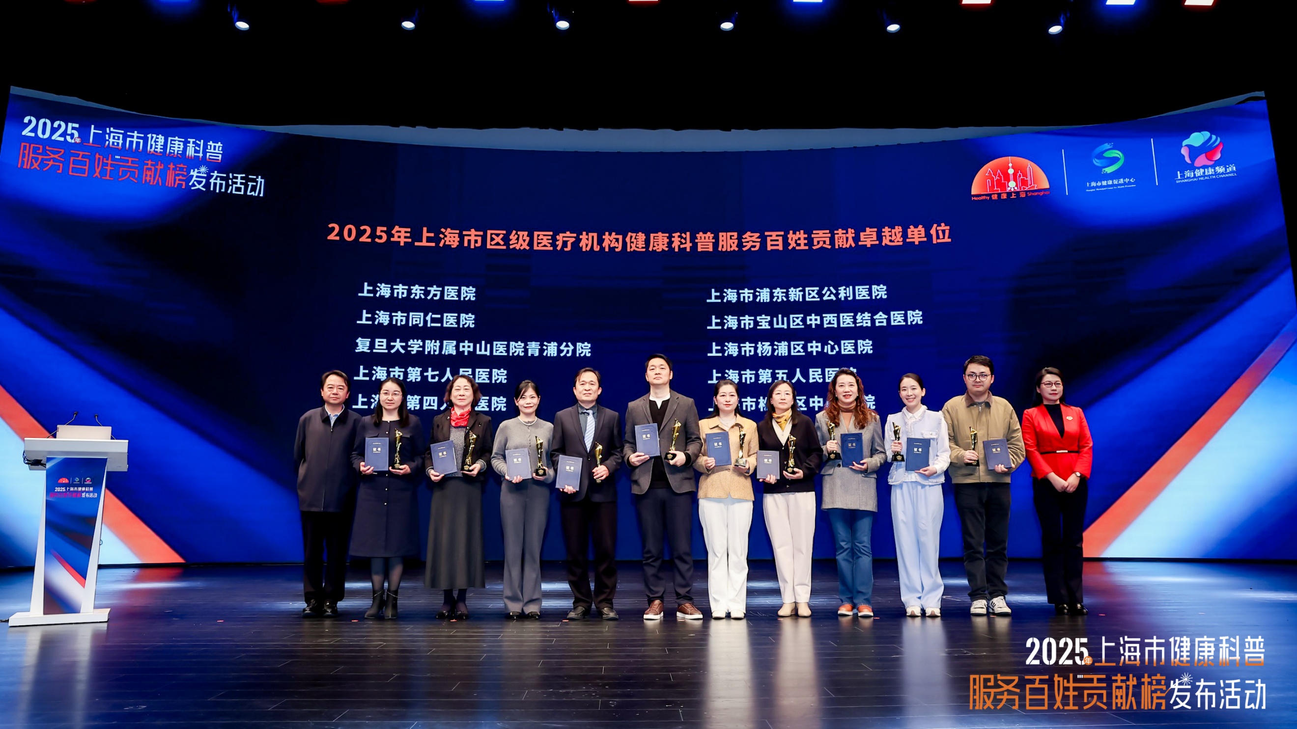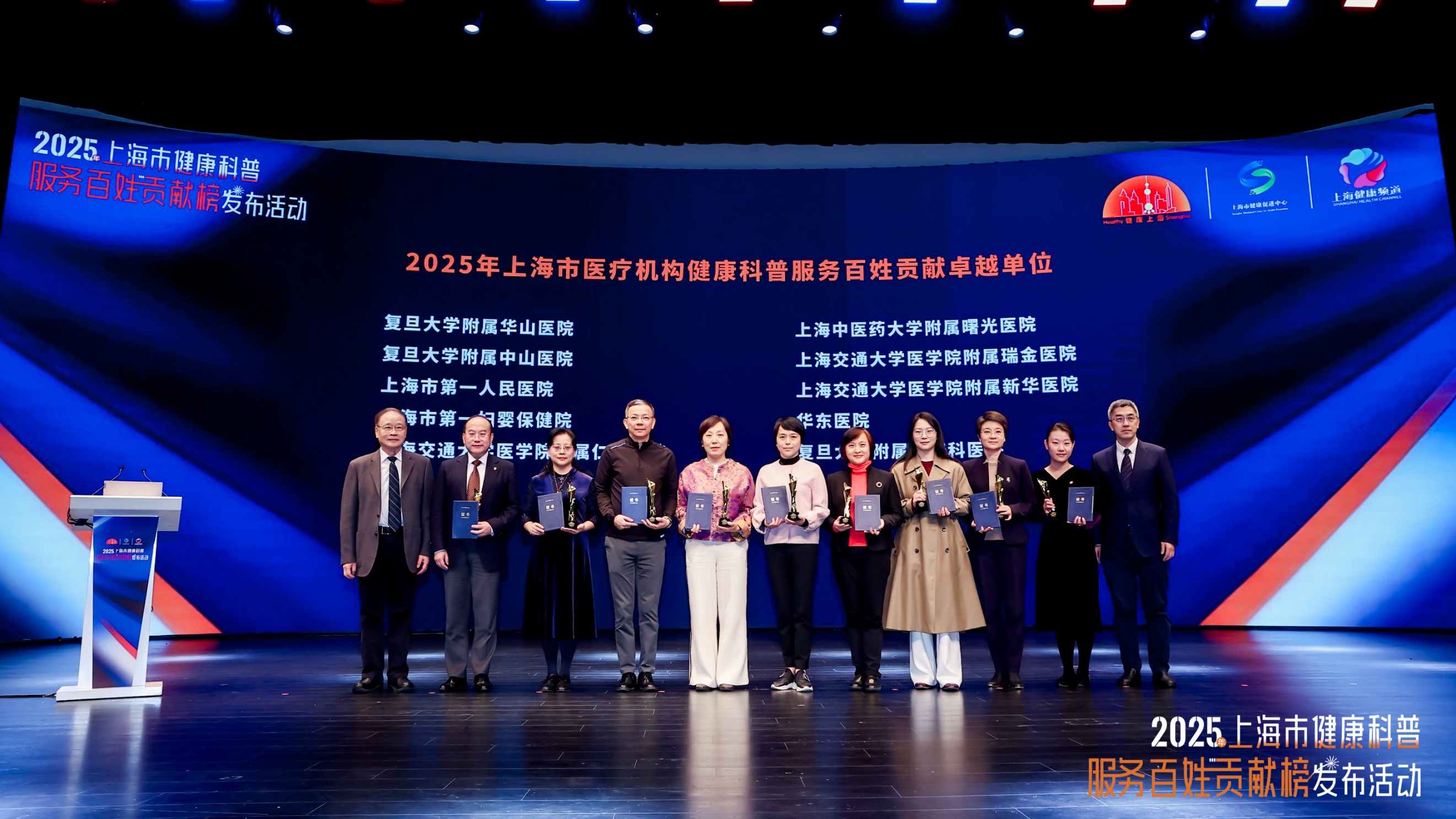 12月11日,由上海市卫生健康委员会、上海市爱国卫生运动委员会办公室主办的2025年上海市健康科普服务百姓贡献榜发布活动在上海商城剧院举行。作为健康上海建设的创新举措,此次发布的榜单涵盖医疗机构、社区卫生服务中心、医务人员等多个维度,旨在通过“立功竞赛”形式,激励全市医疗机构和医务人员投身健康科普事业,为2500万市民健康服务。活动公布了2025年上海市健康科普服务百姓贡献单位与个人榜单,我校系统多家附属医院和医务人员上榜。
