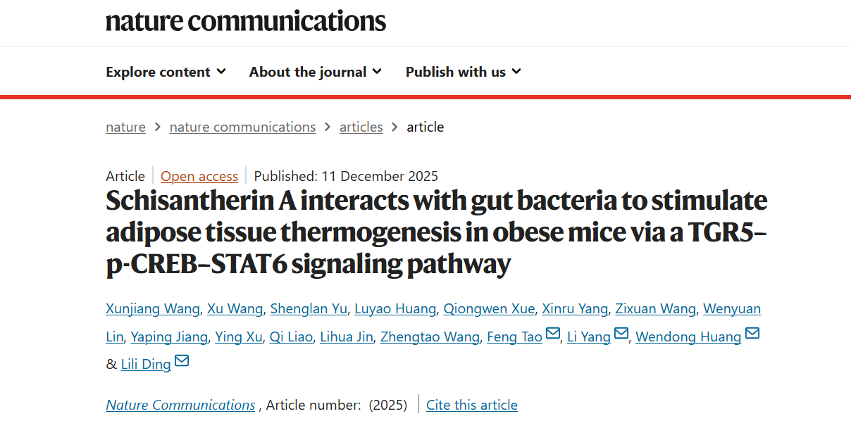 近日,我校中药研究所丁丽丽研究员、杨莉研究员携手上海市中医医院内分泌科陶枫主任和美国希望之城国家医学中心黄文栋教授,在国际权威期刊 Nature Communications 上发表了题为 “Schisantherin A interacts with gut bacteria to stimulate adipose tissue thermogenesis in obese mice via a TGR5‒p-CREB‒STAT6 signaling pathway” 的研究成果。丁丽丽研究团队前期已发现中药五味子成分五味子酯甲对非酒精性脂肪肝有显著改善作用,并兼具减重效果,该研究则进一步揭示了五味子酯甲通过调控 “肠道菌群‒胆汁酸” 代谢轴,激活脂肪组织 “免疫‒神经‒脂肪” 互作网络,从而促进脂肪产热与能量消耗的分子机制,为深入解析低生物利用度天然产物改善肥胖及相关代谢紊乱的共性作用机理提供了重要理论支撑。