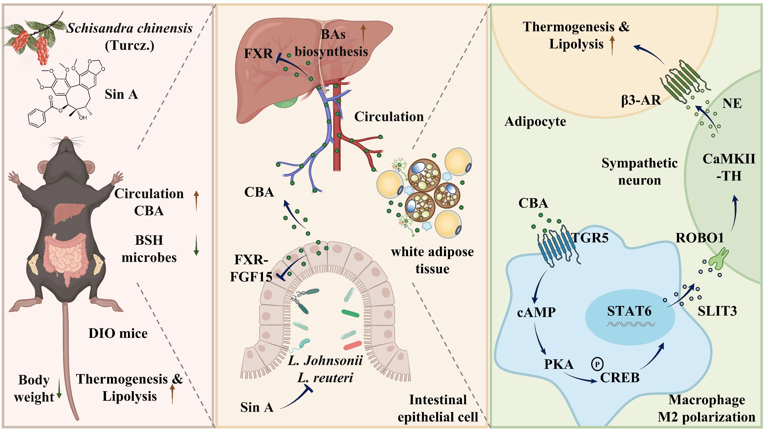 研究首次证实,五味子酯甲(80 mg/kg)体内组织浓度无法直接激活 TGR5/CREB/STAT6 信号通路;其通过降低肠道富含胆盐水解酶菌群丰度、提升结合型胆汁酸水平,进而抑制肠道及肝脏 FXR 核转位,负反馈调控胆汁酸合成,进一步升高循环胆汁酸水平,最终激活脂肪组织 TGR5‒p-CREB‒STAT6 信号级联,介导巨噬细胞向 M2 型极化,促进 Slit3 释放,激活交感神经释放去甲肾上腺素,并启动脂肪产热程序。该过程以 TGR5 依赖的方式,强化脂肪组织巨噬细胞与交感神经的交互作用,最终促进具有代谢获益效应的脂肪产热。此机制的阐明,为解析天然产物及多种代谢干预策略的作用原理提供了全新分子视角。