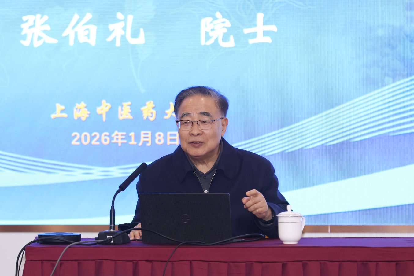 1月8日下午,上海中医药大学“问道学堂”院士大讲堂在中医药国际标准化研究中心辅楼101会议室举行。本期讲堂特邀中国工程院院士、国医大师、现代中药创制全国重点实验室主任张伯礼,为全校师生带来主题为“守正创新,推动中医药高质量发展”的学术报告。