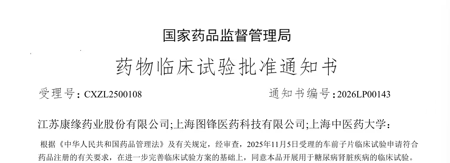 近日,国家药品监督管理局药品审评中心(CDE)发布通知,由我校中药研究所杨莉研究员、王峥涛教授团队与江苏康缘药业股份有限公司、上海图锋医药科技有限公司联合研发的1.1类中药创新药车前子片获得国家药品监督管理局颁发的《药物临床试验批准通知书》,用于治疗糖尿病肾脏疾病。这是中药研究所在中药创新药研发方面取得的突破性进展。