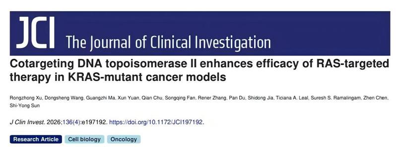 近日,我校市中医临床医学院肿瘤临床医学中心李雁教授团队联合美国埃默里大学孙士勇教授课题组在国际权威学术期刊《The Journal of Clinical Investigation》发表重要研究成果。论文以“Enhancing therapeutic efficacy of RAS-targeted cancer therapy via co-targeting DNA topoisomerase II”为题,首次系统阐明了拓扑异构酶IIA(TOP2A)在sotorasib和adagrasib治疗KRAS G12C突变非小细胞肺癌过程中的变化,并在阐明其调控机制的基础上提出克服靶向耐药的新策略。