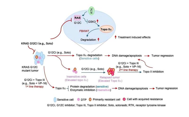 KRAS G12C 抑制剂的问世,打破了其数十年靶点不可成药的梦魇,为携带此类驱动突变患者带来治疗的希望。但目前 KRAS G12C 抑制剂单药(如Sotorasib、adagrasib)治疗疗效有限,如何提升患者的缓解率并延缓疾病进展、提高生存时间和生活质量是临床面临的难题。其疗效不足与耐药性问题日益凸显,亟须开发新型联合治疗方案。研究发现Sotorasib和adagrasib均能促进KRAS G12C突变型癌细胞中拓扑异构酶IIα(Topo IIα)的蛋白酶体降解,并诱导DNA损伤与细胞凋亡。在Sotorasib获得性耐药细胞中,Topo IIα水平升高;无论通过敲低还是vp-16处理抑制Topo IIα,都能在体内和体外增强Sotorasib的抗肿瘤效果,并延缓或者克服Sotorasib获得性耐药的出现。这些发现,不仅确立了Topo IIα作为KRAS G12C突变型NSCLC的治疗新靶点,并提示Topo IIα表达水平可作为预测患者治疗反应及预后的标志物,更为KRAS G12C抑制剂的联合用药提供了新思路,靶向Topo IIα是一种克服KRAS G12C抑制剂局限性的潜在有效策略。