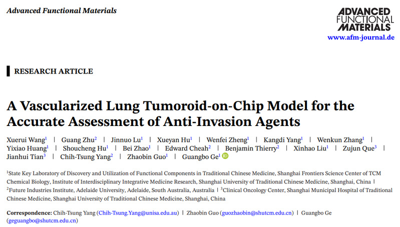 近日,我校交叉科学研究院葛广波讲席教授、郭兆彬青年研究员团队与澳大利亚阿德莱德大学Chih-Tsung Yang研究员团队合作,在国际权威期刊、自然指数期刊Advanced Functional Materials发表题为《A Vascularized Lung Tumoroid-on-a-Chip Model for the Accurate Assessment of Anti-Invasion Agents》的研究论文。该研究成功构建了一种新型血管化肺癌类器官芯片,其不仅可实现肿瘤-血管相互作用的动态可视化,还可通过精准量化肿瘤-血管嵌合体形成等肿瘤转移关键事件,筛选和评价抗非小细胞肺癌转移药物的药效。