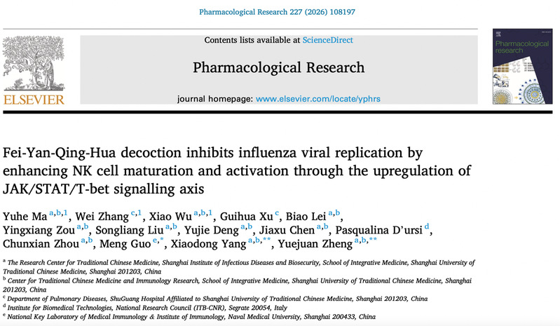 近日,我校中西医结合学院郑月娟/杨晓东团队与曙光医院张炜团队和海军军医大学医学免疫学国家重点实验室郭猛团队合作,阐释中医药复方肺炎清化方促进NK细胞成熟与活化抑制流感病毒复制的作用机制。研究成果“Fei-Yan-Qing-Hua decoction inhibits influenza viral replication by enhancing NK cell maturation and activation through the upregulation of JAK/STAT/T-bet signalling axis”正式发表于Pharmacological Research。