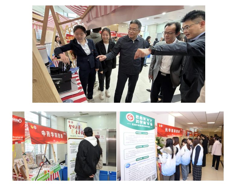 活动同期,“一团一特色”风采展示在图书馆裙楼火热进行,中医药 AI 应用、智能诊疗机器人臂、中医药文化体验等各具特色的内容吸引了许多师生现场体验。全校各基层团组织以图文展板、实物陈列、成果展示、互动体验等形式,全方位呈现思想引领、专业赋能、创新创业、社会实践、志愿服务等领域的特色实践与丰硕成果,成为活动现场一道亮眼的青春风景线。